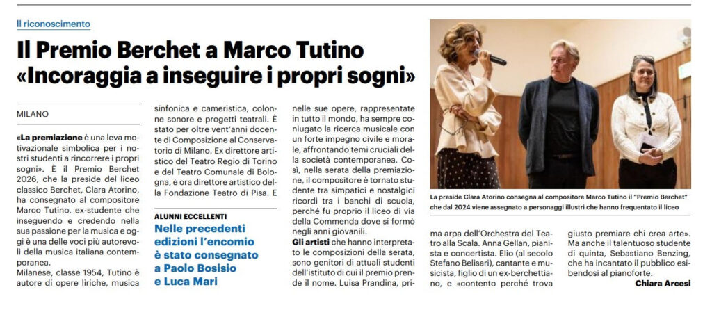Qui sotto troverete i link e le immagini degli articoli pubblicati nelle ultime settimane su testate giornalistiche nazionali, locali e siti web, in occasione del Premio Berchet di sabato 10 gennaio 2026 presso il Conservatorio “G. Verdi” di Milano-sala Puccini ore 20:15.